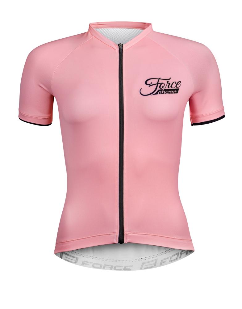 Force Charm je dámsky cyklistický dres s krátkym rukávom, ktorý je vyrobený z 15% spandexu, 85% polyesteru a 10% elastanu (z ktorého je vetracie sieťovina).