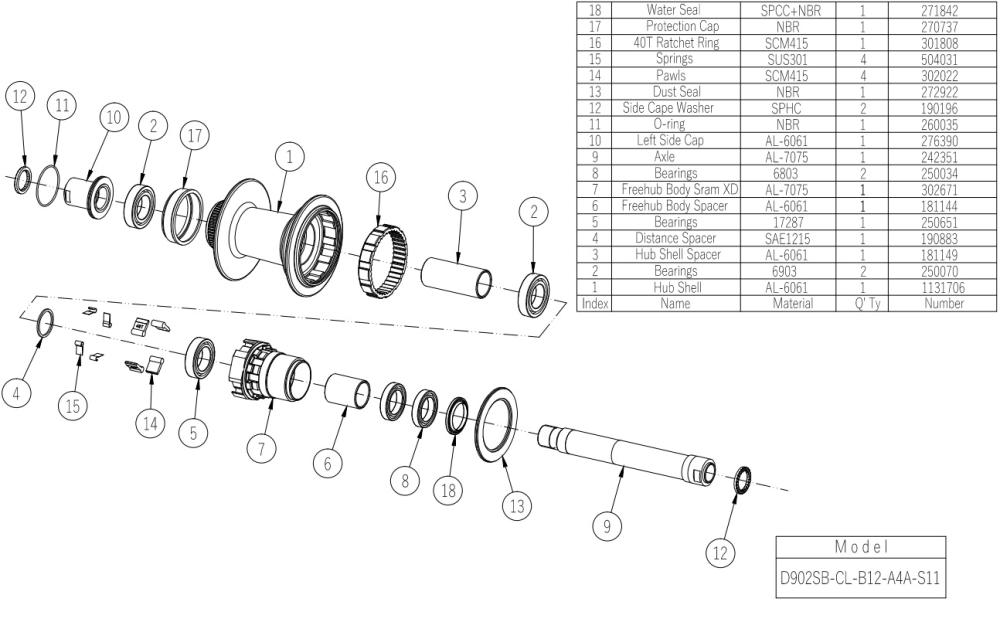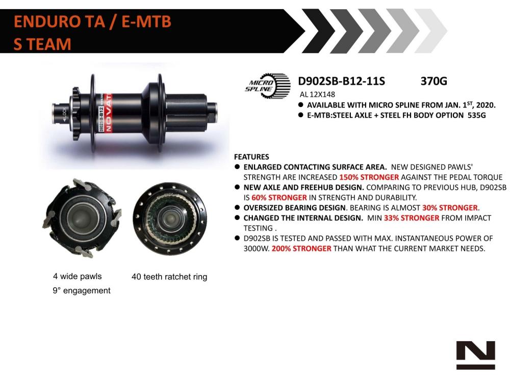 Zadný náboj D902SB-CL-B12-A4A-S11, Centerlock, leštený eloxovaný čierny, 32H/14G, Hliníková os 12x148, bez QR, DH27.9/D44.1, 5x ložiská NBK, račňový prevodník 40T, Sram XD, kazetové telo H-TYPE (404 systém) (E440), 4 západky, čierne bočné krytky, s logom Novatec Laser, OEM
